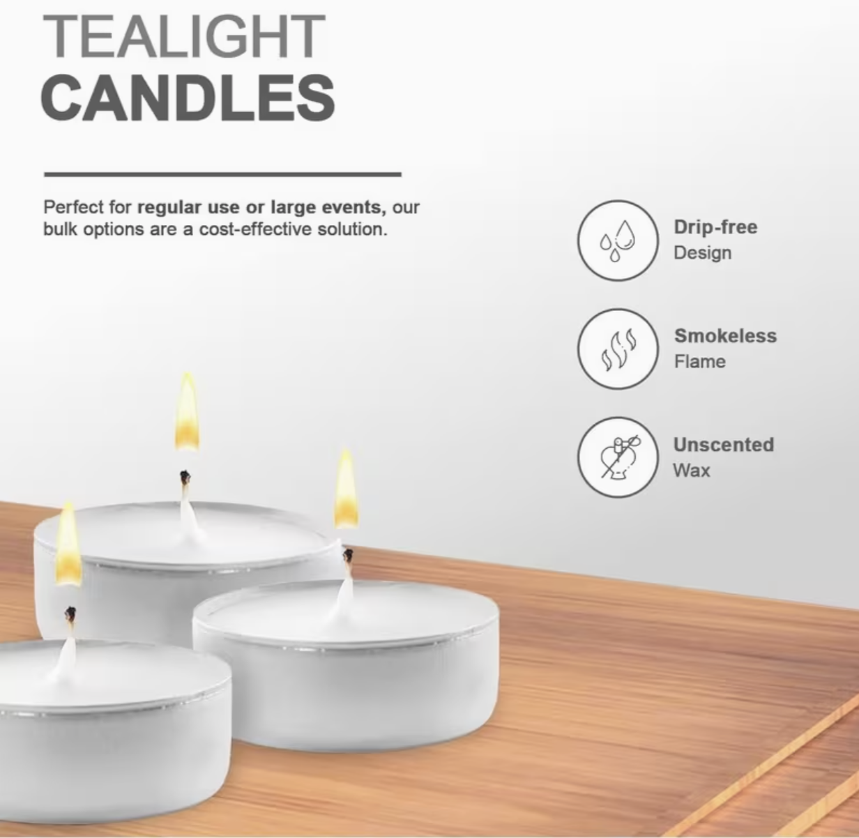 Whether you’re hosting a special event or simply adding a cozy glow to your space, these unscented tea light candles deliver reliable lighting, elegance, and value in one pack.