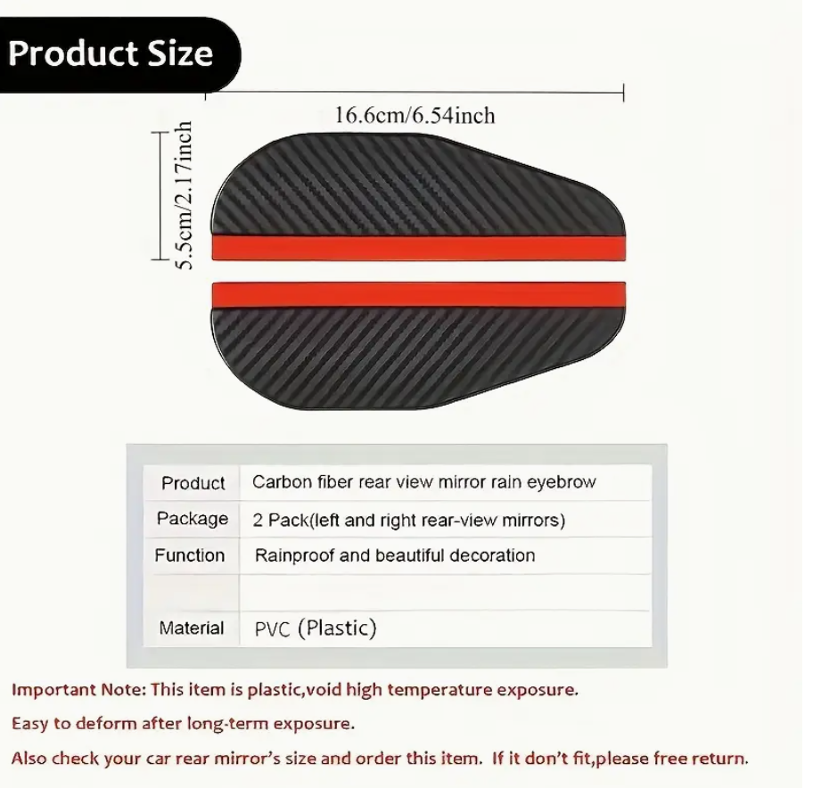 Be the first to review “2PCS Upgraded Carbon Fiber Texture Car Mirror Rain Guards – Windproof Side Mirror Visors | 90% Water Reduction for Clearer Visibility | Aerodynamic Car Mirror Protectors with Sporty Style | Universal Fit for Cars, SUVs & Trucks”