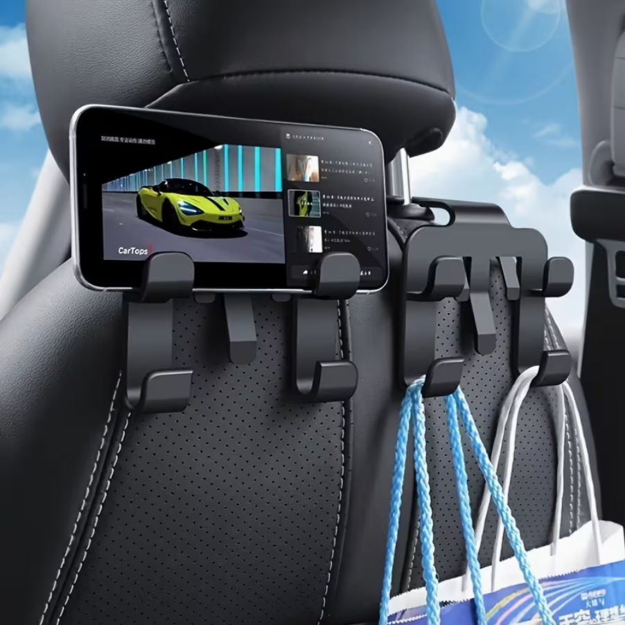 This versatile car accessory works as a seat back organizer hook and a mobile phone holder. Easily hang handbags, shopping bags, backpacks, umbrellas, groceries, baby supplies, or water bottles while securely holding your smartphone for rear-seat viewing.