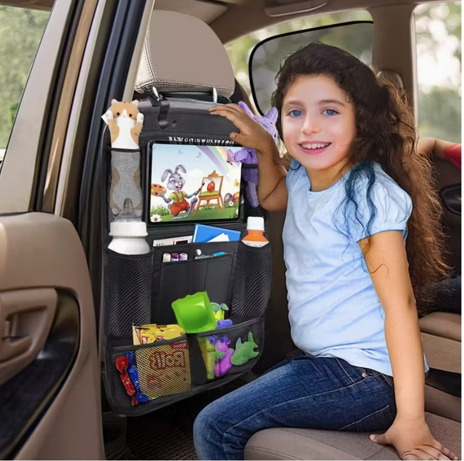 Featuring a built-in iPad/tablet holder, it keeps kids entertained on the go, while the anti-kick rear seat protector helps prevent dirt, scuffs, and shoe marks on your seat backs. Multiple pockets allow you to store essentials such as water bottles, snacks, toys, books, tissues, chargers, and travel accessories—keeping everything within easy reach.