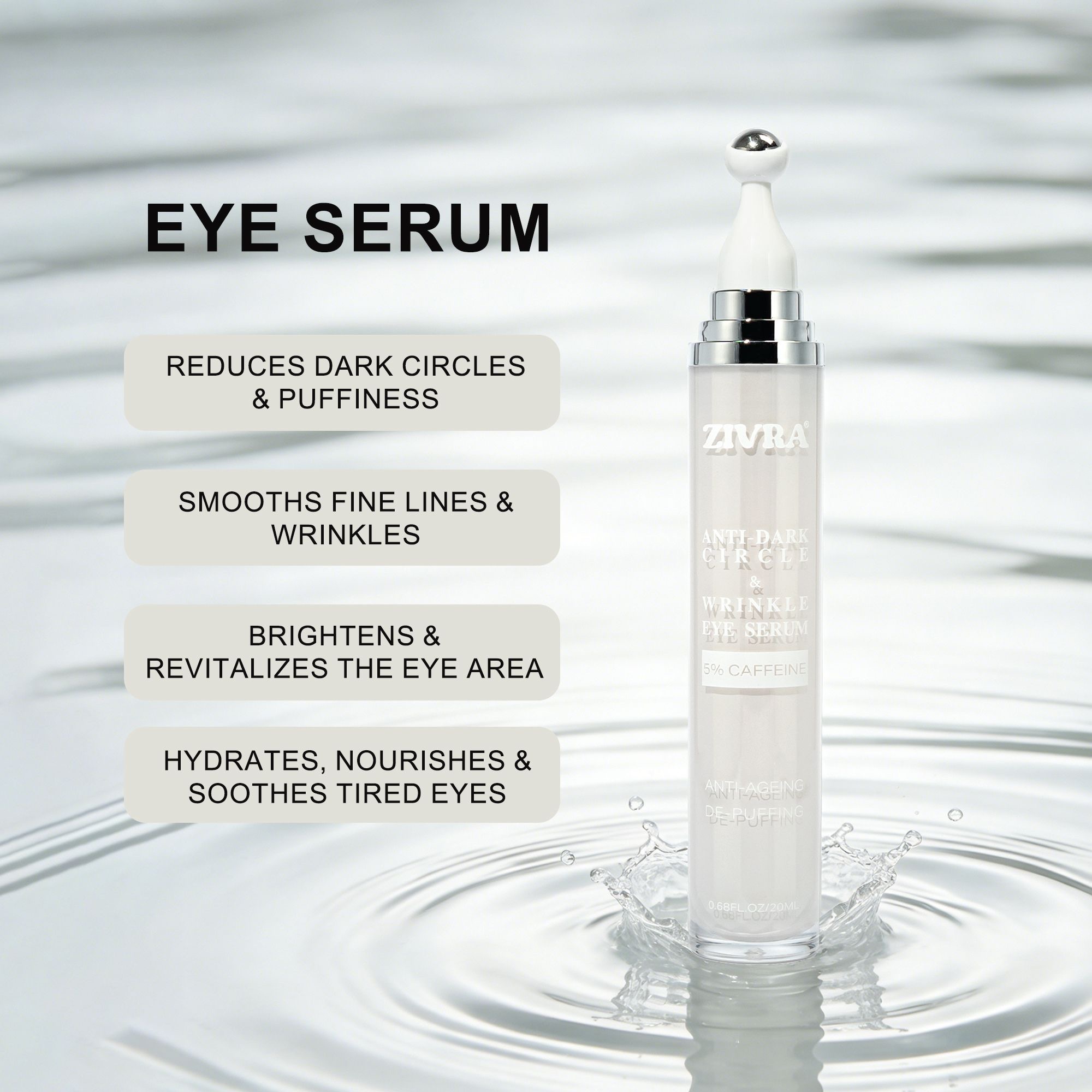 ZIVRA Anti Dark Circle Eye Serum – 5% Caffeine | Anti-Ageing & De-Puffing | 20ml | 360° Roller Applicator