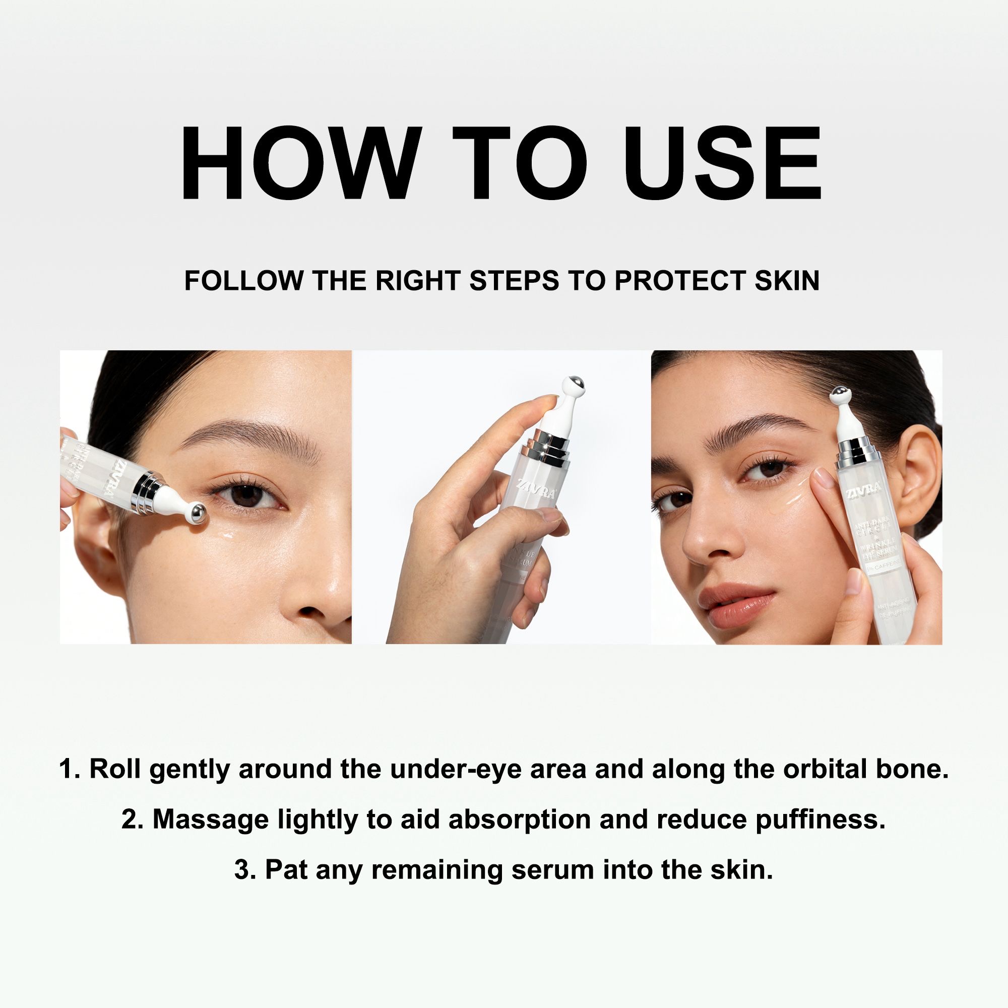 Use the 360° roller to glide under the eyes from inner to outer corner.